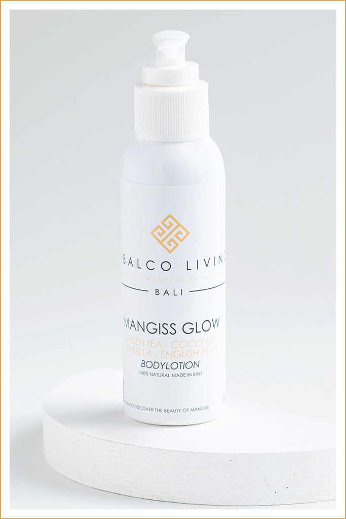 Body Lotion made in Bali with the natural ingredients Green Tea, Coconut, Vanilla and English Pear. Perfect compatibility with the products of the Glow Collection. Deep moisturizing of the skin and gives a smooth and rejuvenated skin. Suitable for all skin types.